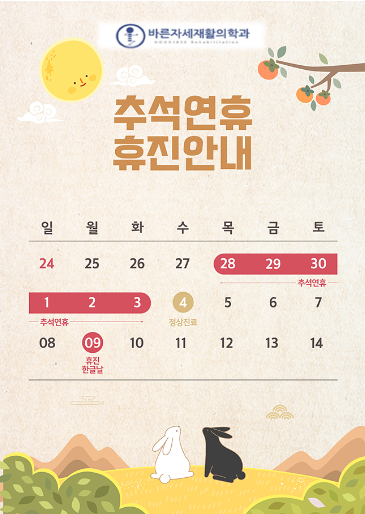 2023년 추석연휴 휴진안내 페이지 정보 바른자세재활의학과 작성일23-09-06 14:28 조회11,459회 이전글 다음글 목록 본문 9/28(목) ~ 10/3(화) 병원 휴진입니다.위 안내문 참고하시길 바랍니다